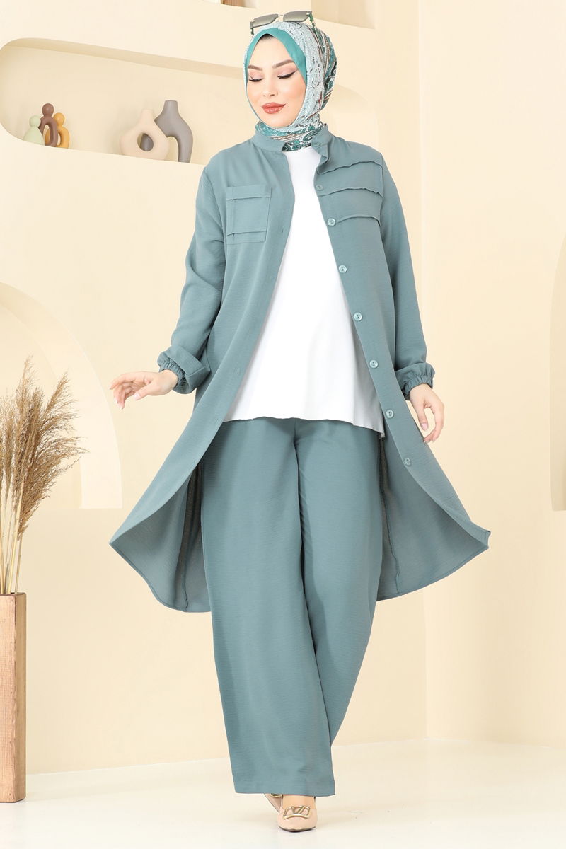 مجموعة الحجاب ذات التفاصيل المضلعة هي منتج حجاب أنيق وعصري. يمكن استخدامه بسهولة طوال الفصول الأربعة. تم تصنيع هذه البدلة باستخدام قماش الأيروبين، ويمكن غسلها بدرجة حرارة 30 درجة مع الغسيل الدقيق. إنه يوفر استخدامًا عمليًا بفضل طوق نصف الرجل وتصميم الأزرار الأمامية. هذا المنتج الذي يتمتع ببنية غير مبطنة يسمح لك بالتحرك بشكل مريح. يتكون من قطعتين تونيك وبنطلون وخصر البنطلون مطاطي. هذه البدلة التي تحتوي على جيب نشط على الصدر وأساور مطاطية، مثالية للاستخدام اليومي.