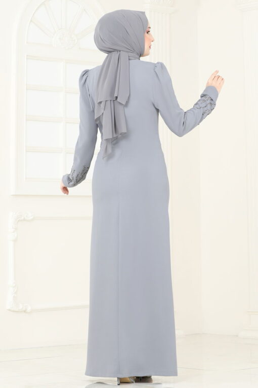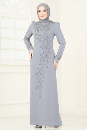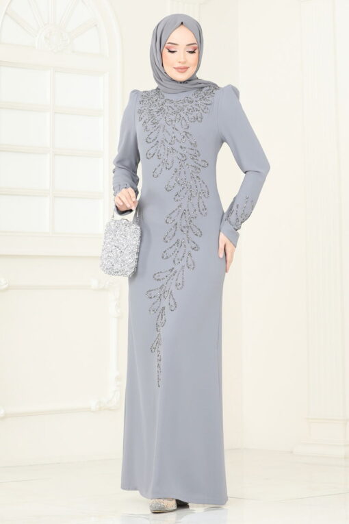 فستان سهرة بتفاصيل حجرية باللون الرمادي