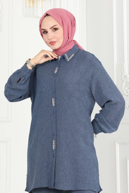 تفاصيل المنتج: إنه منتج أزياء الحجاب للموسم الجديد. المنتج عبارة عن ياقة قميص. المنتج مزود بأزرار في الأمام. سترة لديها شق جانبي. إنه غير مُبطن. تفاصيل الحجر مطروقة. خصر البنطال مرن. أزرار الأكمام نشطة. قد تكون هناك اختلافات في درجة لون المنتج بسبب التصوير الفوتوغرافي.
