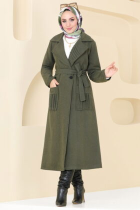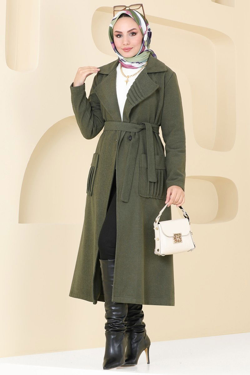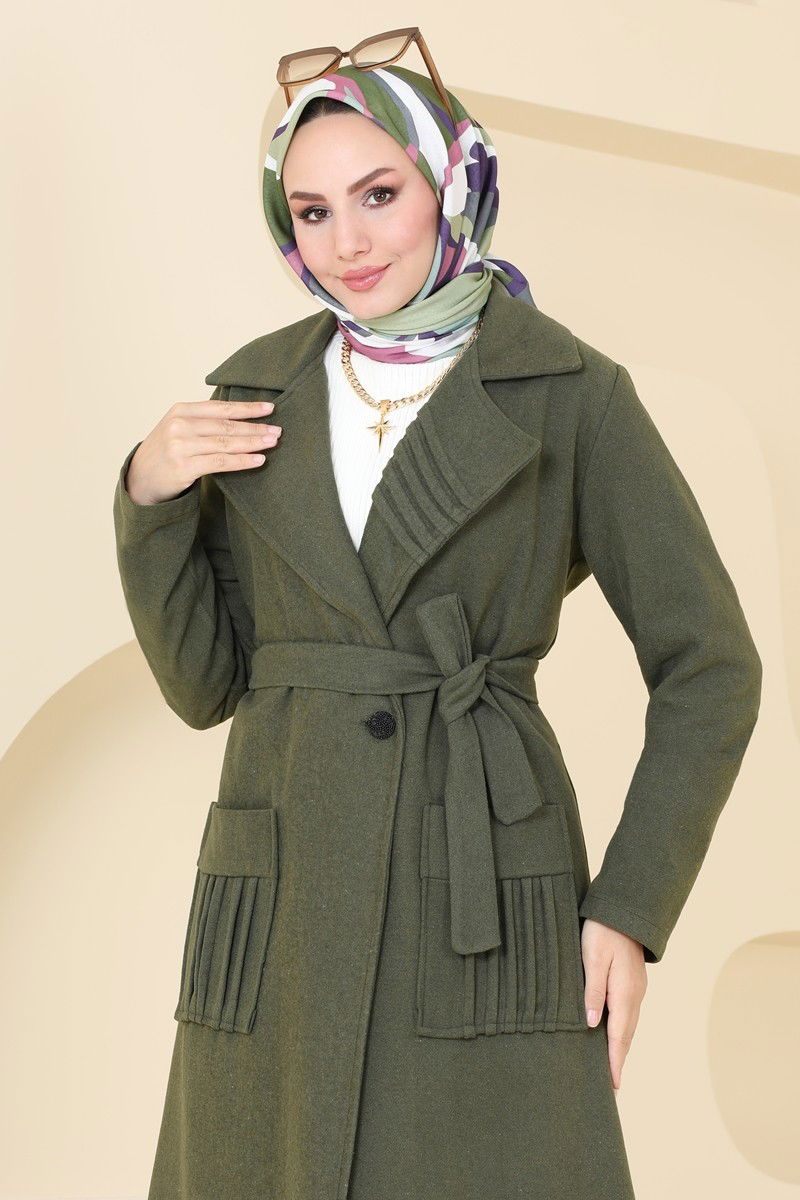 معطف كاشيت ذو تفاصيل مطوية هو منتج نموذجي للحجاب. يمكن استخدامه في فصلي الخريف والشتاء. يجب أن يتم التنظيف الجاف فقط. وهو مصنوع من قماش كاشيت من الدرجة الأولى. المنتج ذو ياقة مزدوجة الصدر. (المنتج الموجود في الموديل مقاس 38.) يحتوي على زر قابل للاستخدام في الأمام وله زرين لمنع الحزام من الرفرفة المنتج، لا يجوز استخدامه بشكل اختياري.
