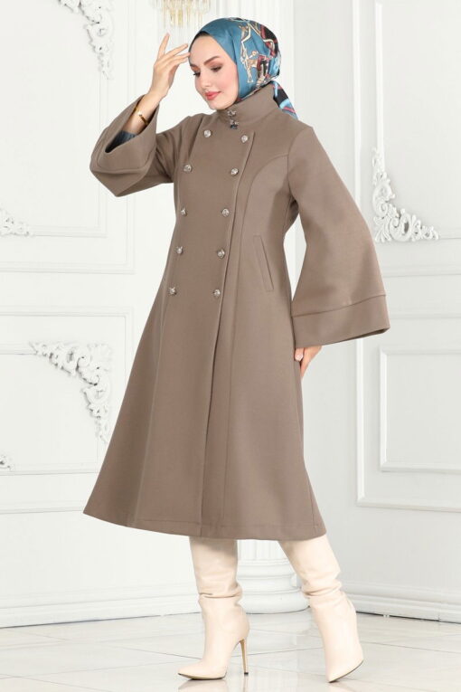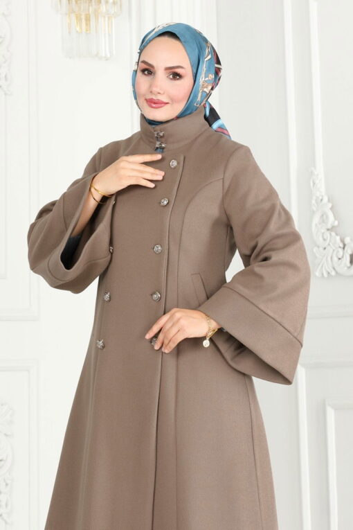 تم تصميم نموذج المعطف ذو الياقة الرائعة خصيصًا لملابس الحجاب. يمكنك استخدامه بسهولة في فصلي الخريف والشتاء. يوصى بالتنظيف الجاف فقط. هذا المعطف مصنوع من قماش Kaşe من الدرجة الأولى، ويتميز بتصميم ياقة نصف رجل وتفصيل أزرار في الأمام. إنه يجذب الانتباه بهيكله غير المبطن والجيوب. (المنتج الموجود في الموديل مقاس 38.)