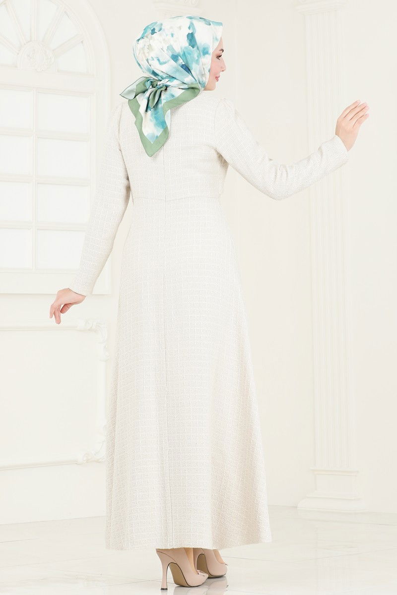 فستان أنيق مع تفاصيل بروش هو منتج نموذجي للحجاب، يمكن استخدامه في فصلي الخريف والشتاء. يمكن غسله في درجة حرارة 30 درجة دون كتابة (غسل محدد) وهو مصنوع من قماش شانيل. المنتج غير مبطن. المنتج به سحاب في الخلف (المنتج الموجود في الموديل مقاس 38). الارتفاع: 160 سم، الصدر: 86 سم، الخصر: 68 سم، الأرداف: 95 سم البروش متضمن في المنتج، ولا يجوز استخدامه بشكل اختياري. تتم خياطة تفاصيل بوليرو على المنتج.