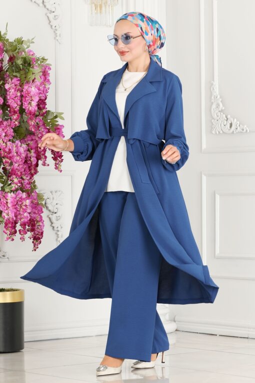 تفاصيل المنتج: إنه منتج أزياء الحجاب للموسم الجديد. المنتج لديه طوق مزدوج الصدر. الحزام غير مُبطن في المنتج، ولا يجوز استخدامه اختياريًا. خصر البنطال مرن. أزرار الأكمام نشطة. قد تكون هناك اختلافات في درجة لون المنتج بسبب التصوير الفوتوغرافي.
