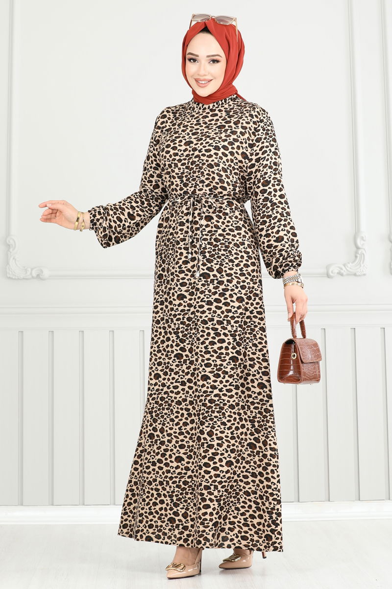 فستان فيسكوز بنقشة جلد النمر بني