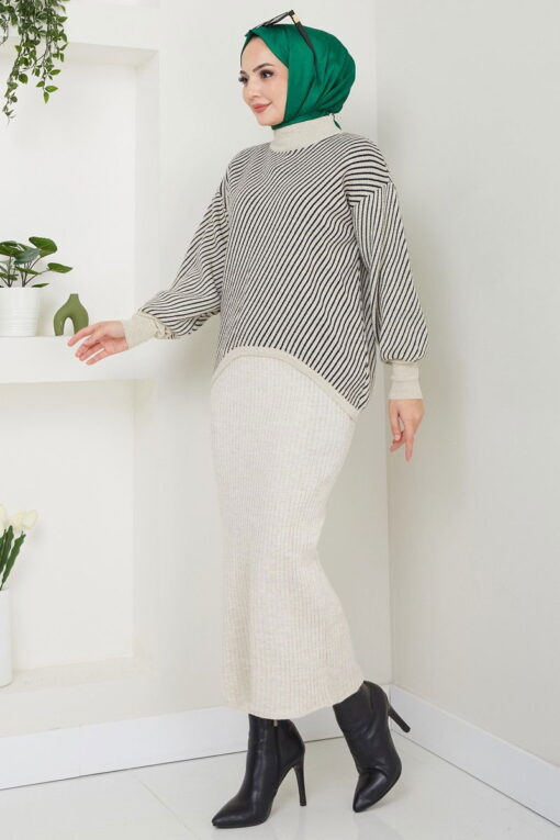 مجموعة سترة مخططة غير متناظرة هي منتج حجاب نموذجي. يمكن استخدامه في فصلي الخريف والشتاء. يجب غسله على درجة حرارة 30 درجة دون عصر. وهي مصنوعة من نسيج محبوك من الدرجة الأولى. المنتج ذو ياقة نصف رقبة وغير مبطن. مقاس المنتج الموجود في الموديل 38. الارتفاع: 160 سم، الصدر: 86 سم، الخصر: 68 سم، الأرداف: 95 سم، الوزن: 52 كجم. اللباس الداخلي يلبس من الرأس وهو بلا أكمام.