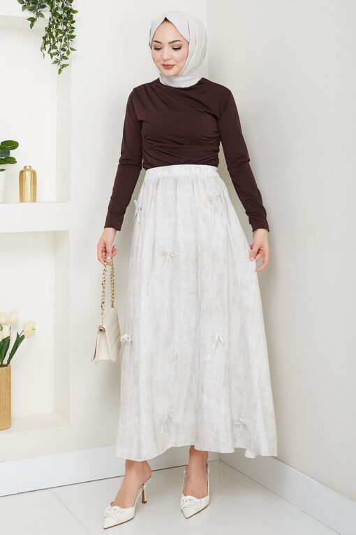 تنورة بنية داكنة بخصر مطاطي وتفاصيل فيونكة