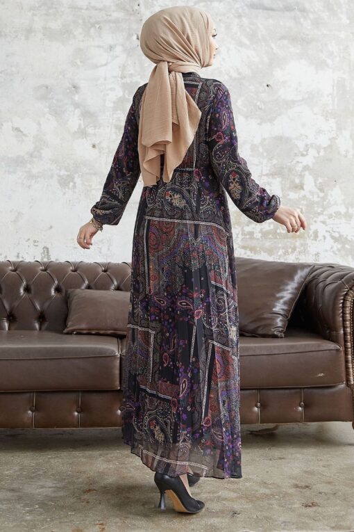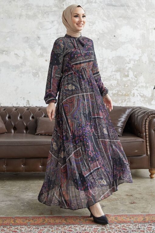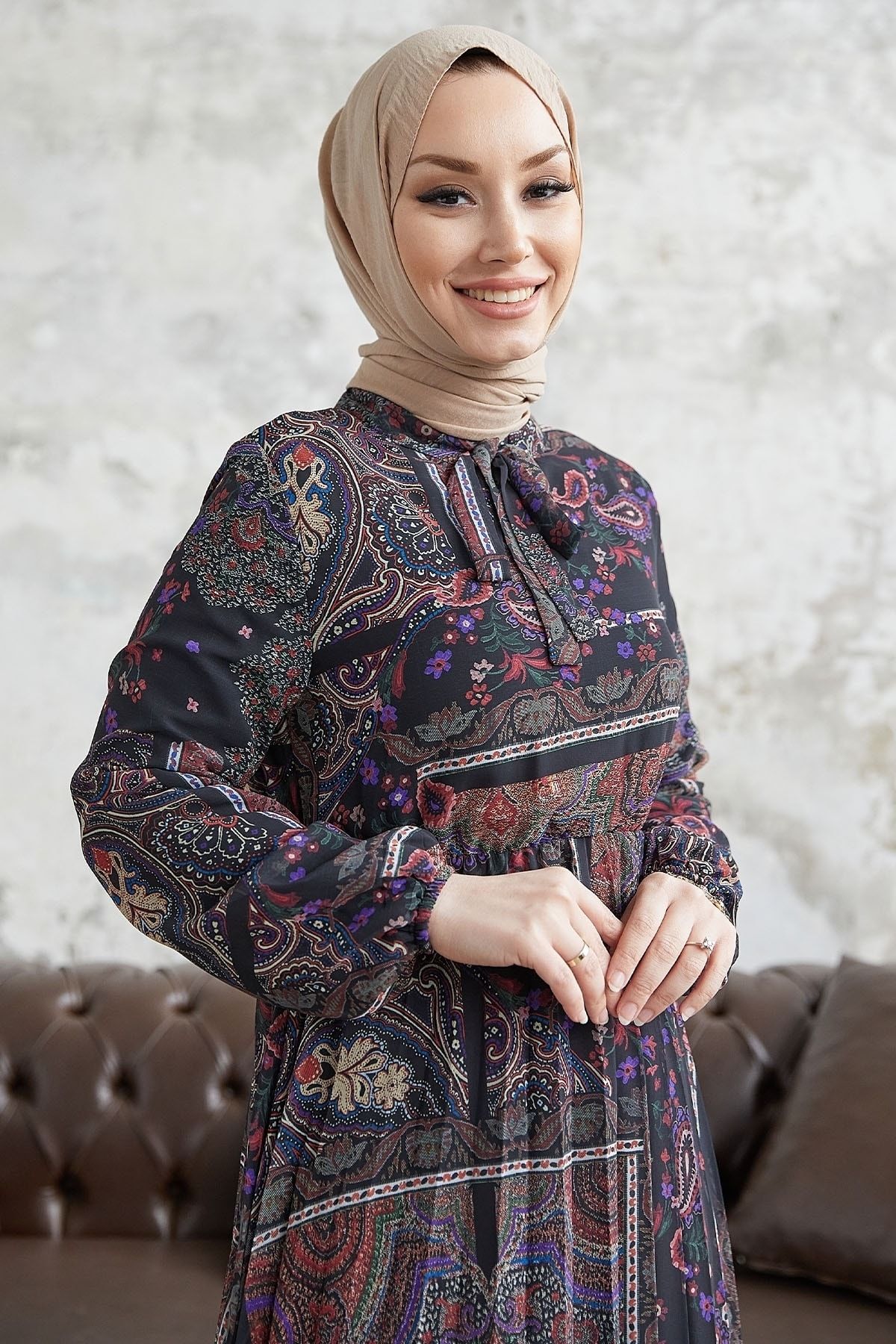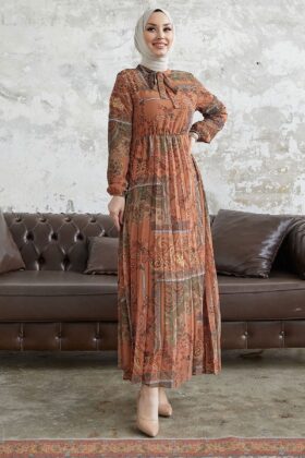 Viera فستان شيفون منقوش شال مع ياقة بحزام