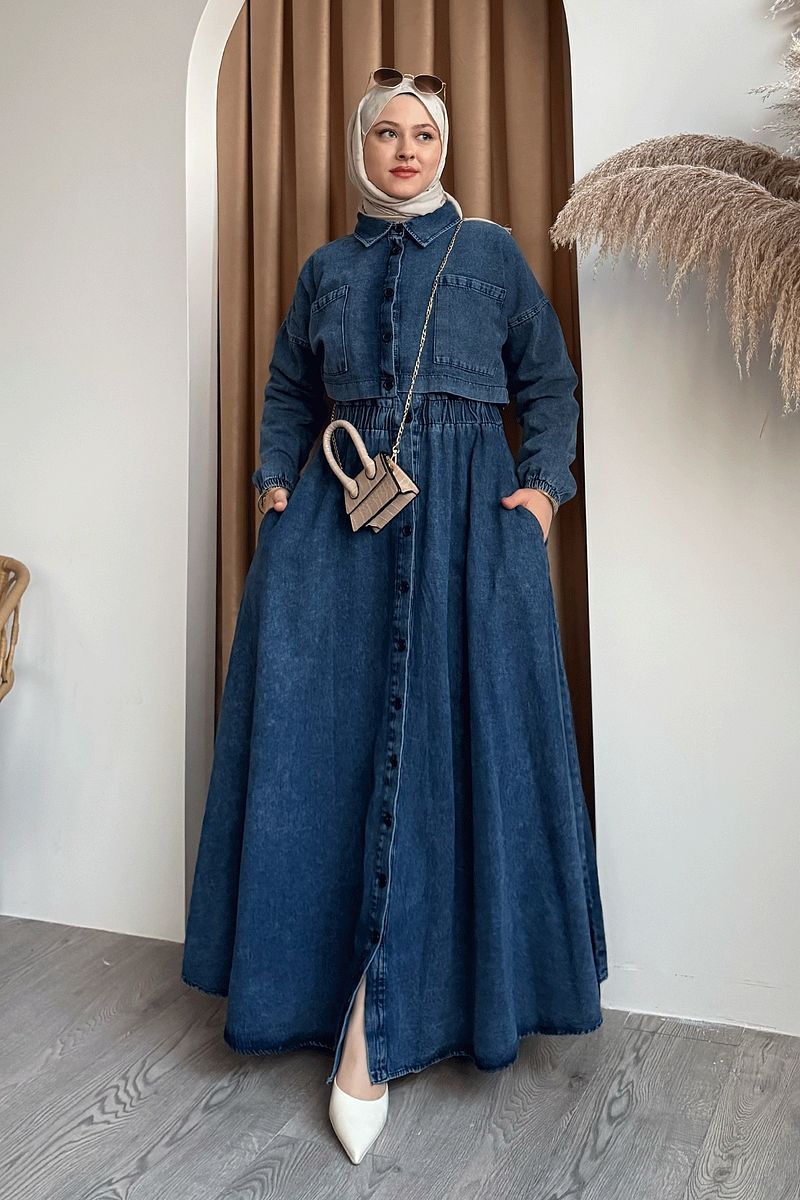 سالوبيت من الدنيم باللون الأزرق الجليدي مع بوليرو وخصر مطاطي