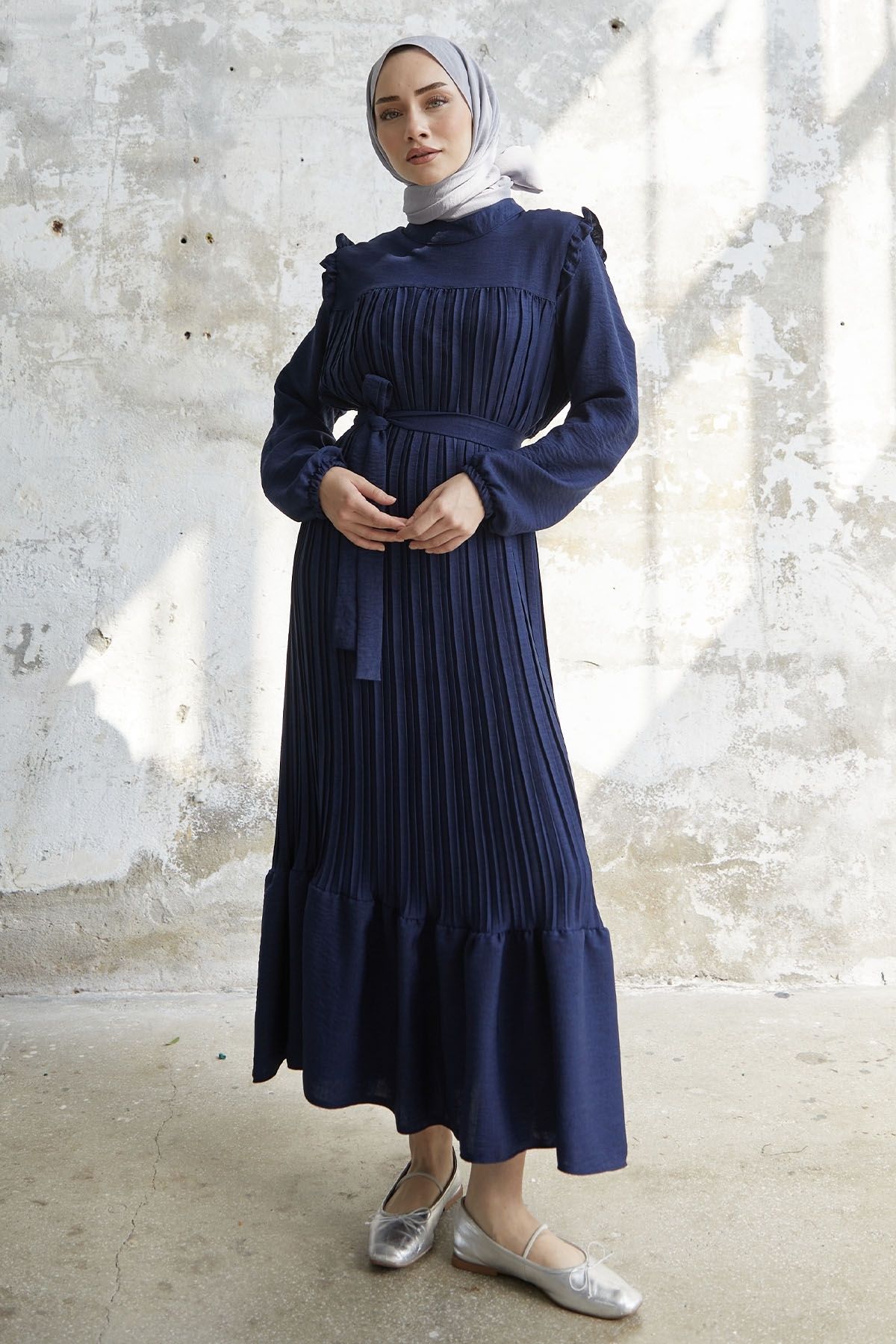 فستان من الكتان ذو طيات وأكتاف مكشكشة